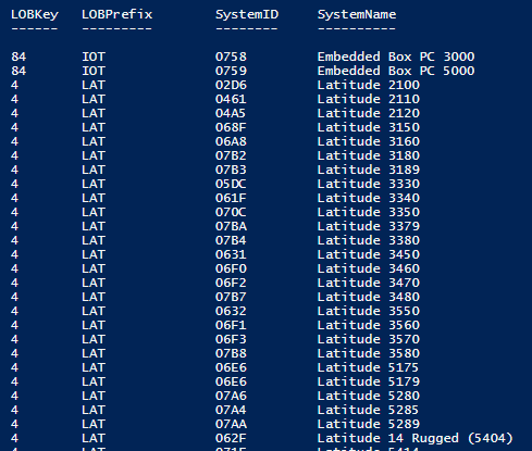 $catalogXMLDoc.DriverPackManifest.DriverPackage | Select-Object @{Expression={$_.SupportedSystems.Brand.key};Label=”LOBKey”;}, @{Expression={$_.SupportedSystems.Brand.prefix};Label=”LOBPrefix”;}, @{Expression={$_.SupportedSystems.Brand.Model.systemID};Label=”SystemID”;}, @{Expression={$_.SupportedSystems.Brand.Model.name};Label=”SystemName”;} –unique
